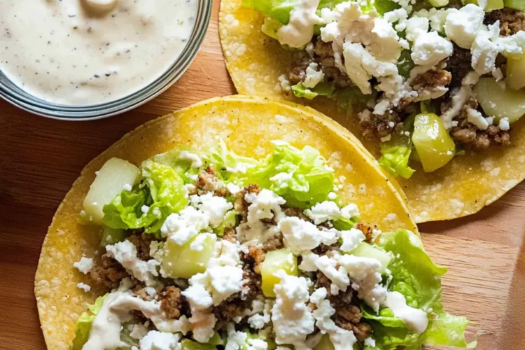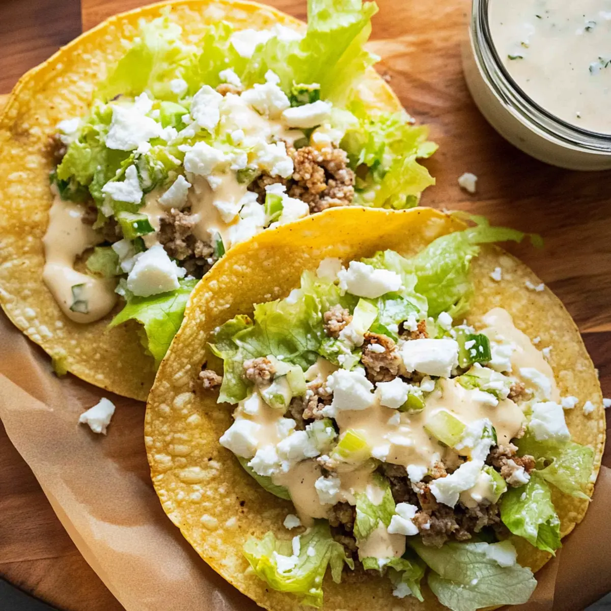- Layer cooked tacos with romaine lettuce and feta cheese, drizzling dressing over the top.
