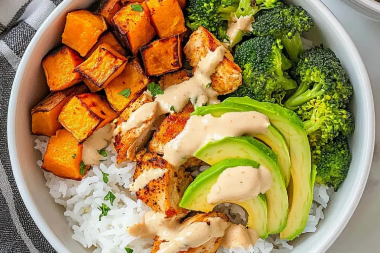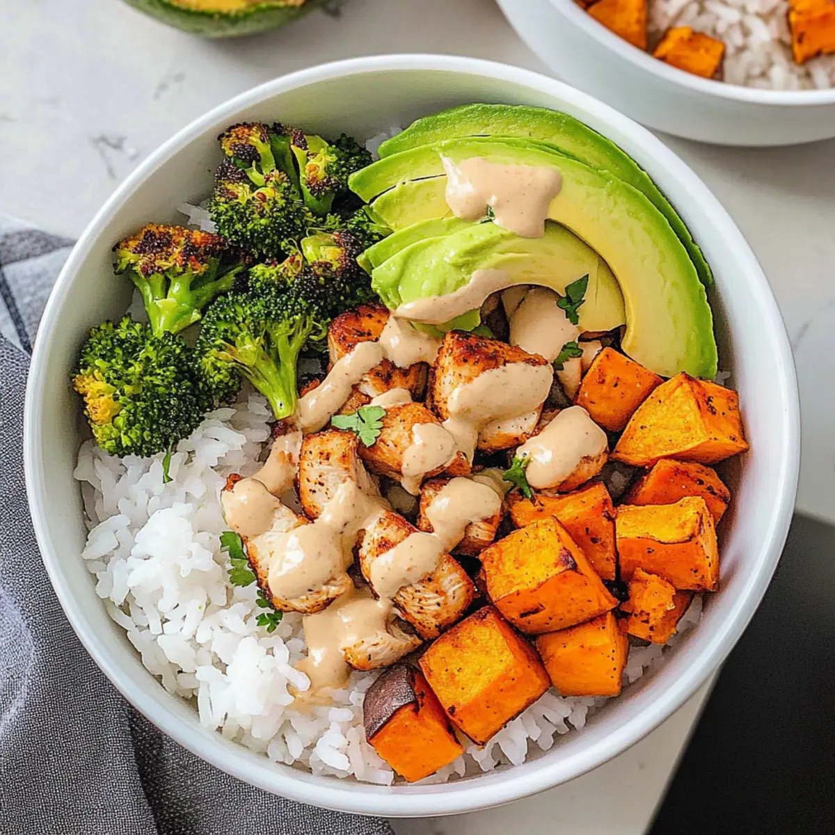 - Assemble the bowls starting with a base of rice, layering the chicken, sweet potatoes, and broccoli, topped with avocado and chipotle sauce.