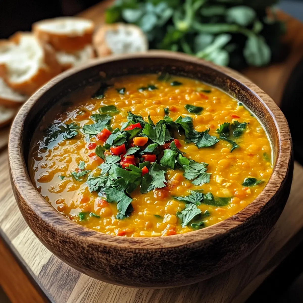Ladle the hot soup into bowls and garnish with fresh cilantro, adding a pop of color and flavor. Serve your comforting Coconut Red Lentil Soup immediately, and enjoy the warmth and richness of each delightful spoonful.