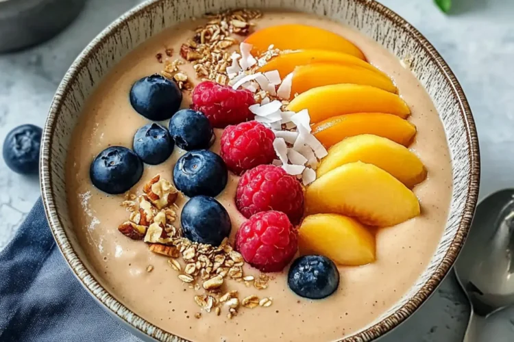 Now comes the fun part! Customize your Peaches and Cream Smoothie Bowl by sprinkling on your favorite toppings such as toasted coconut flakes, a handful of nuts or seeds for crunch, and some granola for delightful texture. Don’t forget to scatter fresh or frozen berries on top for added antioxidants and visual appeal, ensuring a vibrant breakfast experience.
