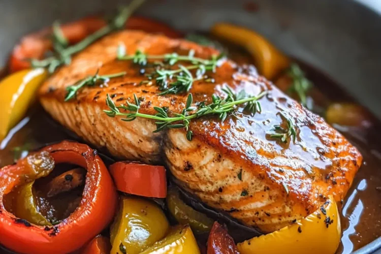Stir in hoisin sauce, soy sauce, and chicken broth to create a savory sauce. Return the browned salmon fillets to the skillet, nestling them among the vegetables. Spoon the sauce over the fish to ensure every bit is covered, and let everything simmer gently for 2-3 minutes until the salmon is heated through and well-coated in the rich sauce.