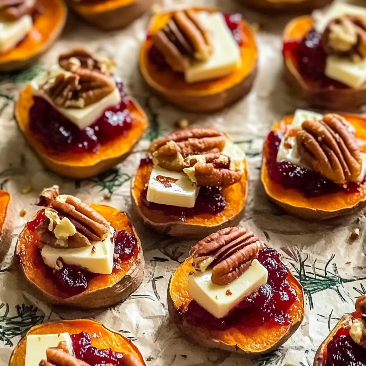 - Top each sweet potato round with a generous spoonful of cranberry sauce, followed by a slice of creamy brie.