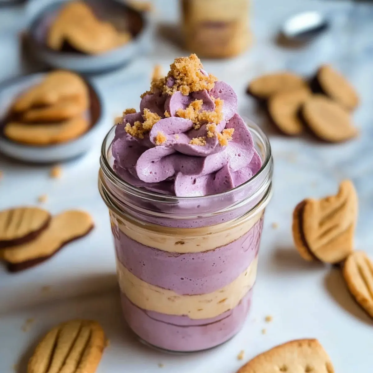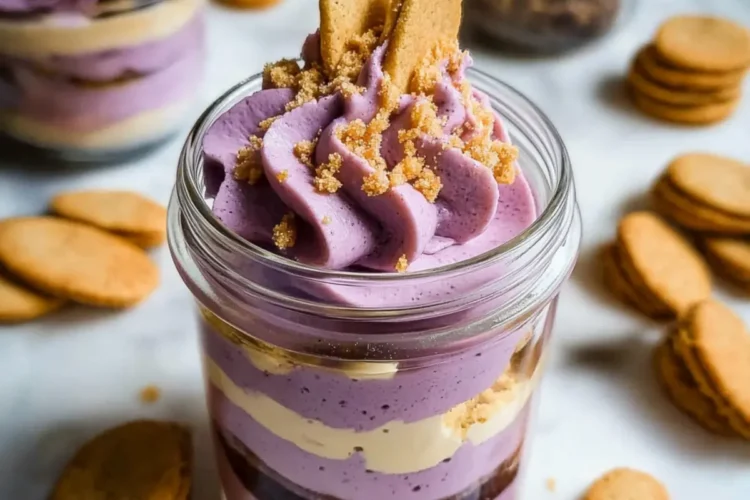 Garnish Joyfully: Top with whimsical crushed ube cookies or whipped cream before serving for a delightful finish that elevates your Ube Tiramisu in a Jar.